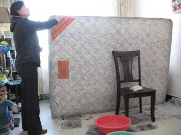 上午11点半左右,黄女士家的一间卧室里,地上摆着两个盛着半盆水的塑料盆,地面上铺的几十张报纸也都湿透了,一个湿的床垫立在椅子旁边。楼顶上的一个吊灯周围都是水,不断有水滴落下来。过了大约半小时,塑料盆里接满了水,楼顶东北角湿了一片。