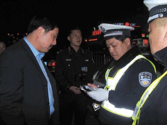 20时50分,在凤凰台路口,一辆黑色轿车没开灯自南向北行驶,被执勤交警拦停,司机下车后,满口酒气,酒精测试结果显示他的血液酒精含量竟达157mg/100ml,属严重醉驾,交警依法对其罚款1500元、扣12分、吊销驾照一年。当晚该路口查处酒驾3起。