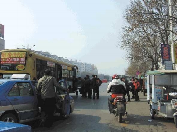16日中午,记者在汽车总站南侧的建设路上看到,四五辆出租车和五六辆三轮车杂乱地停在建设路北侧,占去接近一半的马路。前后两辆公交车在离站牌约5米处停下,等车的行人纷纷跑到路中间上车。