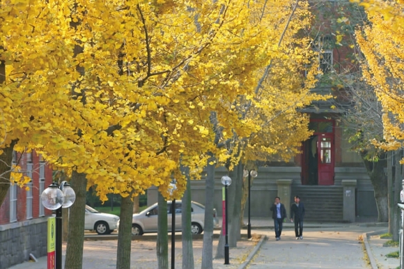 16日,在青岛理工大学的校园内,沿路两旁的银杏已经全部成了黄色,美不胜收。随着岛城气温不断降低,岛城各个景点的秋季观赏的彩叶植物都将陆续凋落。
