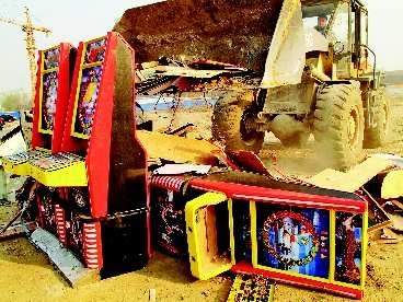 本报11月16日讯(记者王金强 通讯员 李杰)16日下午,在德州市德城区陈公堤口一片荒地上,随着一台挖掘机的轰鸣,80多台电子游戏赌博机被砸为碎片。当日下午,德城公安分局在此举行了电子游戏赌博机集中销毁行动。