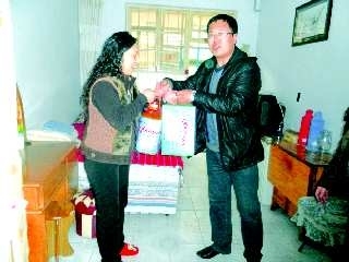 16日下午,毓潢顶街道办事处和毓潢顶西社区居委会把油、米等物品发放到困难居民邵丽娜家中。据悉这些物品都是烟台市生活服务网络中心提供的。图为网络中心主任徐健把爱心送到邵丽娜家里。本报见习记者李园园摄