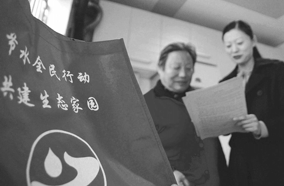为迎接国家节水型城市的评比,16日,泰安市节水办公室的工作人员走进泰前街道办事处国华社区,宣传节水。图为国华社区工作人员(右)为社区居民张女士宣传节能常识。