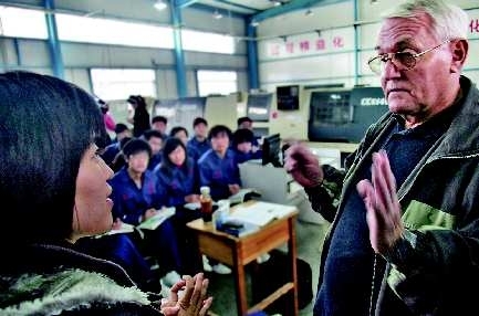 16日上午,在济宁职业技术学院,来自德国的退休专家库尔特·马夸特正在为学生们授课°据了解,应济宁市外专局邀请,德国专家库尔特·马夸特和布鲁诺·豪雅在济宁职业技术学院进行为期—周的访问,并走进课堂讲课°