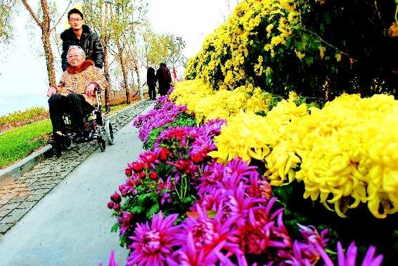 11月18日,气温较前日略有回升,午后阳光明媚,市民纷纷来清风湖游玩。清风湖畔菊花争奇斗艳,引来许多市民观赏。本报见习记者任小杰 摄影报道