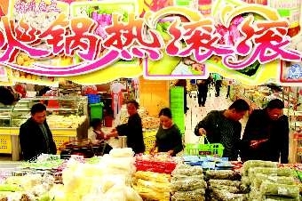 18日,在市区一家超市内,市民在选购火锅配料o随着天气变冷,御寒食品受到市民欢迎,商家也看准时机进行促销o 记者 廖杰 摄