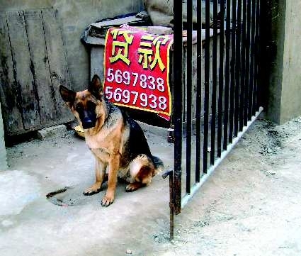 时间:2010年11月;地点:河南开封;自述:一家商业银行制作的喷绘广告被风刮掉后,被一位养狗者拣到废物利用做成了狗窝的门帘。点评:原来可以到这里来货款。