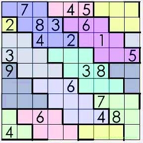 每行/列都是1~9,每个黑粗线框也是1~9,框的边线上下左右的连接起来构成9格,为了观察方便已经用不同颜色标识,也就是说每种颜色的是1~9。您可以通过逻辑推理得到答案。