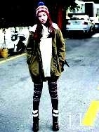 鲜艳的色调十分吸引众人的目光,同时给人活泼的印象,搭配毛绒领的风衣,看起来就十分保暖;与之相配的绒线帽,也随着全身花色的变化变成拼色的配色造型,这样让全身的色调搭配显得更为协调。