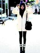 很多人都尝试过的深灰色连裤袜,—定要搭配浅色的衣服,对比中才能显出瘦瘦的双腿;紫色绒线帽的出现,不经意间从色调角度增添了搭配的乐趣,让你在人群中显得格外抢眼。