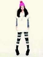 复古感的1eggings图案搭配可爱的毛毛图案的短袖卫衣,穿出小魔女的感觉;依旧是粉色绒线帽,给魔幻感觉增加了—分可爱感觉。