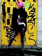 以黑色为主色调的黑白横条纹连裤袜,增添了几分率性的感觉,与灰色风衣,黑色帽子形成很—致的色调呼应;如果觉得这样的配色难免单调,内里搭配的卫衣不妨也参考图中的亮色印花款。