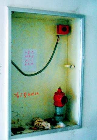 沿着楼道再往东走,所有的消防栓玻璃门上面红色醒目的“消防栓”三个字和左下角的“119”标识都被揭掉了,打开之后,里面的消防设施同样是不翼而飞。