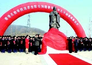 18日上午,随着铜像身披的红绸落下,庄严的孔子铜像展露圣容,正式成为学校一道亮丽的文化风景和标志性建筑。“鲁东大学是烟威地区首个接受汤恩佳先生捐建孔子铜像的单位。”鲁东大学基建处处长周吉福话语间难掩自豪之情。