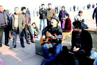17日,在烟台市滨海景区,几位年轻人自带乐器尽情歌唱时下流行歌曲,引得众多游客驻足欣赏。据悉,这几位年轻人非常喜欢唱歌,来到海边练唱功是因为这里人多,可以练习胆量及适应能力。本报记者 赵金阳王鸿光 摄