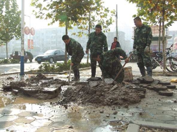 18日上午8点左右,市区振兴路和新纺街路口附近一处供水管道破漏,影响周边百余户人家供水,下午5点抢修完毕,图为维修工人在抢修。