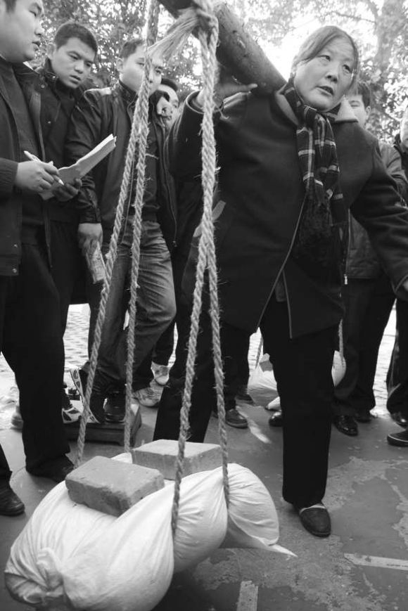 18日,聊城市公用事业管理局在人民公园举办职工趣味运动会。图为在“谁是大力士”的项目比赛中,一个50多岁的大妈轻松挑起180多斤重的沙袋。