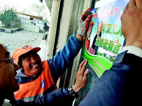 18日,本报记者与环卫工人—起为德州共青团路上—处环卫工人歇脚点挂牌o本报发出设立歇脚点的号召后,许多市民纷纷来电询问,许多沿街商铺积极响应号召,挂牌设立歇脚点。 本报记者苏超 摄影报道