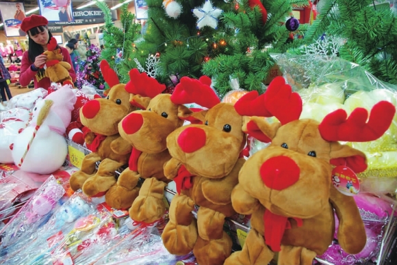 18日,在宁夏路一家大型超市内,可爱俏皮的圣诞鹿吸引了市民的眼球。据了解,距离圣诞节还有一个多月的时间,商家已经精心布置好了琳琅满目的圣诞商品栏,让人早早品尝到了圣诞的“味道”。