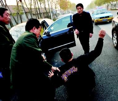 运管人员将欲溜走的“山寨”出租车司机截住。