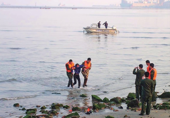 17日下午,在荣成市石岛管理开发区,一位打工妇女因与丈夫吵架,一怒之下下海轻生。她从石岛海滨公园海滩走入海中,在海水中浸泡了一个多小时。石岛边防派出所民警现场苦劝多时,该妇女就是不肯返回岸边。不得已,两名民警涉水下海,将该妇女强行救回。 本报通讯员 赵传振 摄