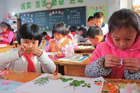 近日,南山小学在全校开展了“奇妙的树叶拼图”比赛。学生在老师和家长的指导下,采集各种形状的植物叶子和花瓣,压榨干燥后自己动手做成树叶拼图。图为18日,学生在美术课上天马行空,将收集的树叶做拼图。