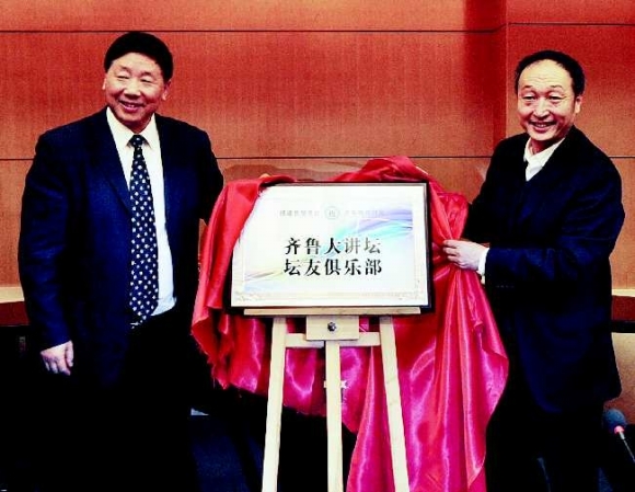 11月19日下午,坛友俱乐部成立仪式在山东新闻大厦举行。中央社会主义学院党组书记、第—副院长叶小文(左)和全国劳模许振超为坛友俱乐部揭牌。本报记者 张中
