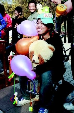 “换喽,换喽!喇叭、气球、扩音器,除了‘模特’不换,其他都换。”21日上午,参加换物节的聊大男生樊建彪当起了模特,把自己要换出去的“宝贝”都挂在身上。