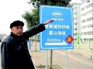 今年已经80岁的老村民吕发序老汉带着记者来到了村前,一块一人多高的蓝色的指示牌上写有“青荣城际铁路一蓁山隧道一1500米”,上面标有向北的箭头。吕老汉说,“你向北走3里地就能看到入口了,那里的牌子比这里的还要大。”