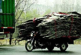 11月21日,在德州大学路上,—三轮车司机深深陷进货物里,路上车来车往,见此无不纷纷躲避。