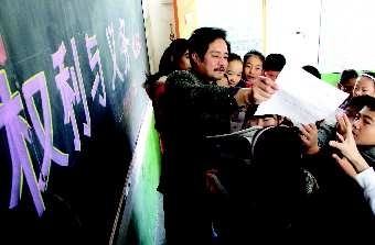 23日,在北宫大街小学6年级3班教室内,班主任正在向学生发放“我的权利与义务”的填写表,学生可根据意愿填写自己的“权利与义务”,然后把学生们的填写意见进行汇总、筛选以及举手表决,最终制定学生们自己的权利与义务的执行手册。该校王宝君校长介绍,希望借此从小培养学生的民主意识。