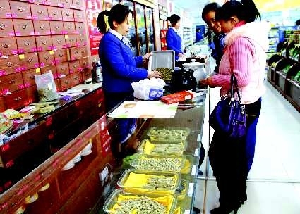 22日,在人民广场地下一大药房内,市民在购买进补药材。据了解,入冬以来,鹿茸、海马、人参等进补药材开始热销,不少药店都推出了进补药材专柜。