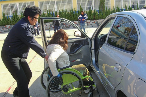 22日上午,在威海市车管所驾考考场,双下肢残疾的荣成姑娘杨红岩在民警的搀扶下上车参加桩考。当天,6名首批参加驾考的残疾人全部顺利通过桩考。目前,威海市已有20名符合条件的残疾人在鲁东驾校学车。