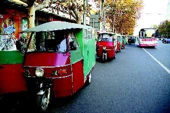 11月22日下午,在黄海一路友谊商店公交停靠站,五六辆三轮车停在公交站牌下拉客,将公交站堵了个严严实实,公交车不能靠站停车,乘客上车也很危险,存在很大的安全隐患。本报记者徐升 摄影报道