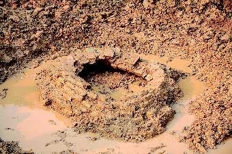 这座古墓葬位于武城大屯水库库区西北部,墓葬开口距地面约2.3米,墓室的穹隆顶已塌陷,墓室内积满淤泥。墓门呈塔形,位于墓室的南壁,有封门砖。残存墓室呈蹄形,高约1.3米,由青砖砌成,南北长2米左右,北端宽约2.3米,棺床南北宽1.3米。