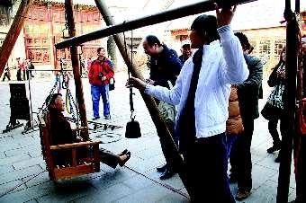 在淄博市周村区一景区,一位老人坐在古老的杆秤上称体重。古为今用,其实也是一种时尚。
