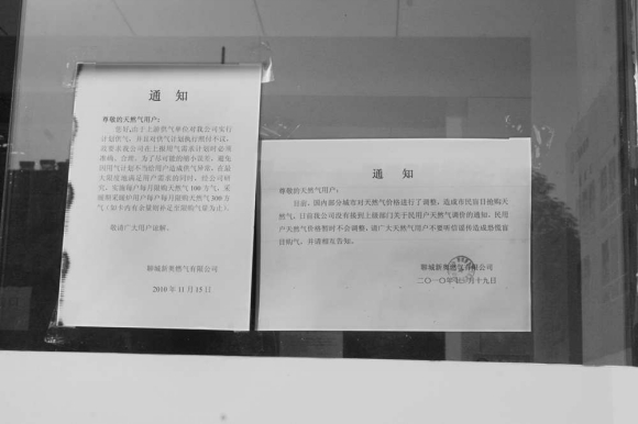 22日上午,记者看到,在振兴东路的聊城新奥燃气营业厅的门上,贴着两张写给天然气用户的通知。其中一张通知上写着限购天然气的数量和细则。另一张通知上写到,目前,他们公司没有接到上级部门关于民用天然气调价的通知,民用天然气价格暂时不会调整,请广大天然气用户不要听信谣传造成恐慌盲目购气。