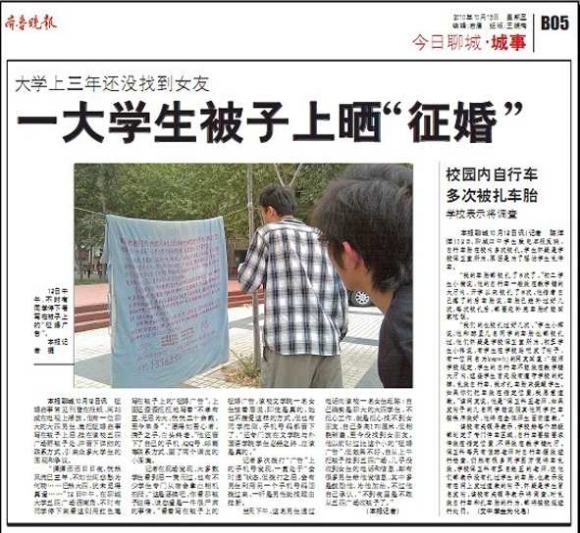10月13日本报C05版刊登《一大学生被子上晒“征婚”》一稿,立即引起众多市民热议及多家网络和电视媒体转载。一月之后,因“晒被子征婚”风靡聊大的“被子哥”再出新招,印了4000份“真心找朋友”传单,雇用6名女生帮着散发。他在接受本报采访时一再表示,希望大家一定要相信他的真诚。