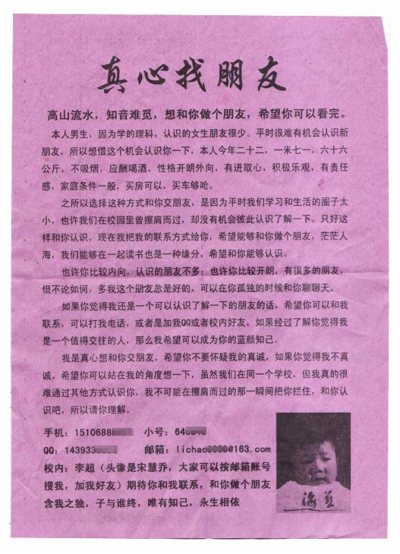 李超后来做了调查,问了学院里十几名女生,大多都接受这种方式,“只是劝我在行文上要比上次含蓄一些,这次还换了联系方式,印上了自己一百天时的照片。总共印了4000张,两个校区各3人帮我发,已经接到了不少女生的电话和QQ添加请求,但还没来得及解释上次的事。”