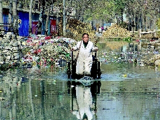 23日上午,记者来到位于东平县州城镇的东平县第一人民医院,医院西侧的一条道路已经完全被污水覆盖。蓝黑色的污水上散布着许多漂浮物,不时发出阵阵恶臭。这时,一名穿着靴子拉着一车垃圾的男子从东平县第一人民医院出来,蹚过污水后,他将垃圾倒在已被污水包围的垃圾堆上。