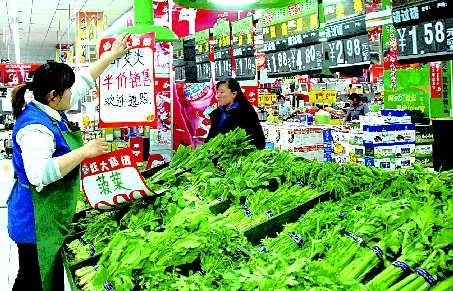 23日,记者在辽河路一家超市看到,销售人员正在促销油菜、菠菜、芹菜之类的“叶菜”,每斤比市场价要便宜2-3毛钱。超市销售人员称,一方面是紧跟国家平抑物价的措施,另一方面也是为了让更多的顾客得到更多的实惠,“物价确实有点高,低价销售,顾客更容易接受”。下午4点左右,超市工作人员干脆半价销售,“这些菜过夜之后就没法卖了,与其浪费还不如便宜点卖给顾客”。
