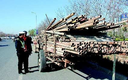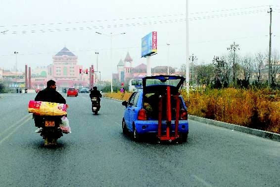 11月18日傍晚,辽河路上一辆小型汽车拖着一架大机器自西向东行驶,车上的两人用手抓着机器,有时还开到机动车道上。小图为11月22日,东营市黄河路上被执勤交警拦下的超载农用拖拉机。