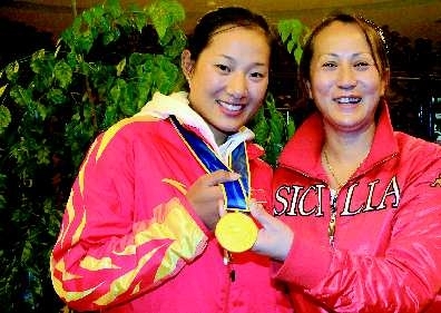 右图:23日晚,王宁抵达日照后,与启蒙教练韩景波共持金牌合影,分享胜利喜悦。