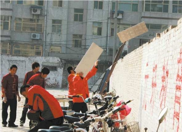 23日,卫育路银领商务中心院内,附近酒店的的工作人员隔墙往外仍废旧瓷砖。他们说,瓷砖太大垃圾桶放不下,所以扔到墙外去。墙外是片闲置空地,但万一此时有人经过,会非常危险。