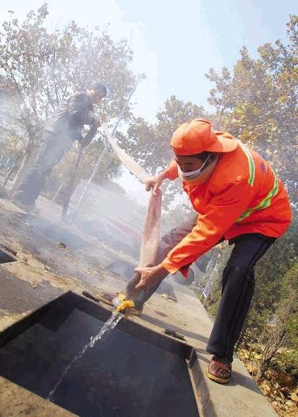 随后,环卫处调来了一辆清洗车帮助灭火。但是由于不是专业的灭火车,水箱内没有水压,于是,清洗车司机张胜友和赵建林捋着水管,帮着张文明往垃圾池里浇水。