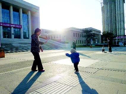 23日下午,烟台文化中心广场上,一对祖孙玩着追逐游戏。夕阳洒在二人身上,让人心中平添一份暖意。 本报记者 赵鑫 摄