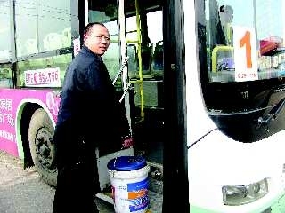 23日,在烟台公交集团第一汽车公司,驾驶员将车内专用防滑沙提上车。为更好地应对冰雪等恶劣天气,保证乘客冬季安全出行安全,公交集团在所有场站、公交车上都提前准备了专用防滑沙。