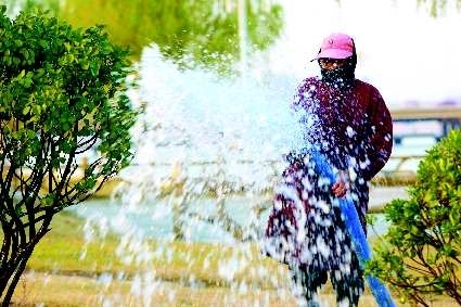 23日下午,在市区街头,一位工人正通过洒水车喷水管,对滨河路两侧的绿地进行灌溉。入冬以来,由于天气持续干旱,市园林局出动50余辆洒水车,对滨河路23公里范围内的绿地进行灌溉。