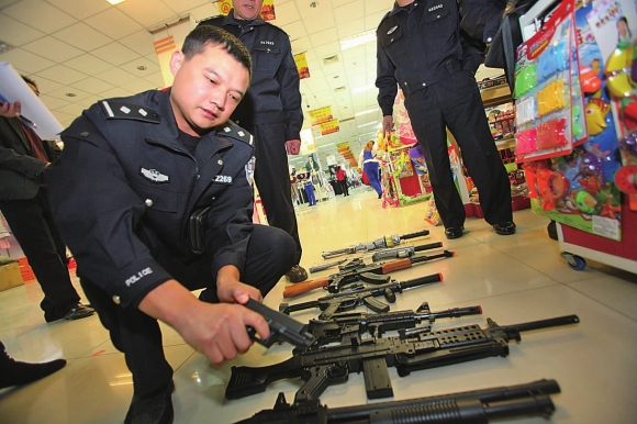 日前,民警在胶州部分商场、地下商城查获部分正在销售的仿真枪弹。近日,岛城治安管理部门对非法贩卖管制刀具、仿真枪、弓弩的摊位进行全面调查、摸底,共排查早夜市、农贸市场等地区1500余处,共收缴仿真枪700余支,管制刀具近千把。