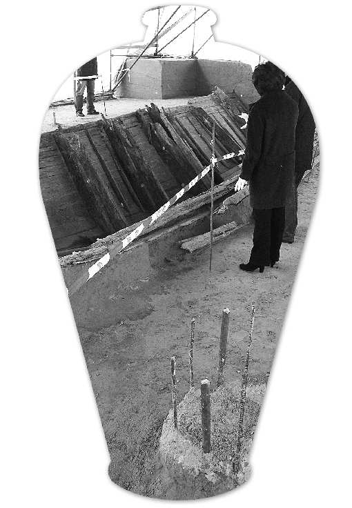 在沉船的旁边,记者发现,现场存有若干水泥基柱,这是建设单位为建高楼打下的,几乎“钉”遍沉船四周。菏泽沉船考古队队长、省文物考古研究所副所长王守功介绍,包括三件元青花在内的绝大多数船载重要文物,都是在该船“九号船舱”(曾命名“二号船舱”)发现的,这里也是此船雇主的居住舱。